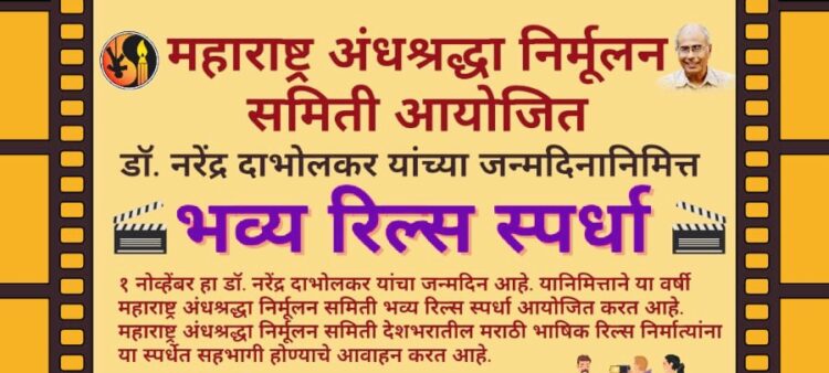 डॉ. नरेंद्र दाभोलकर यांच्या जन्मदिवसाच्या निमित्ताने ( १ नोव्हेंबर) महाराष्ट्र अंधश्रद्धा निर्मूलन समितीच्या वतीने भव्य रिल्स स्पर्धा आयोजित करण्यात आली आहे. देशभरातील मराठी भाषिक रिल्स निर्मात्यांना या स्पर्धेत सहभागी होण्याचे आवाहन अंनिस तर्फे करण्यात आले आहे.