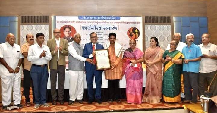 धुळे : शहीद डॉ. नरेंद्र दाभोलकर स्थापित महाराष्ट्र अंधश्रद्धा निर्मूलन समितीच्या अध्यक्षपदी निवड झाल्याबद्दल अविनाश पाटील यांचा धुळे येथे कार्यगौरव समारंभात सत्कार करण्यात आला. या प्रसंगी सुप्रसिद्ध विधीज्ञ उज्वल निकम, कुलगुरु डॉ. विजयकुमार माहेश्वरी, अँड. एम. एस पाटील, अँड. बाप्पुसाहेब जे.टी. देसले, सत्यशोधक किशोर ढमाले, नाटककार शंभु पाटील, आर्किटेक्ट चेतन सोनार, वासंती दिघे, बी.एस.पाटील, डाँ. संजय पाटील आदी उपस्थित होते. समविचारी संस्था संघटनांनी या कार्यक्रमाचे आयोजन केले होते.