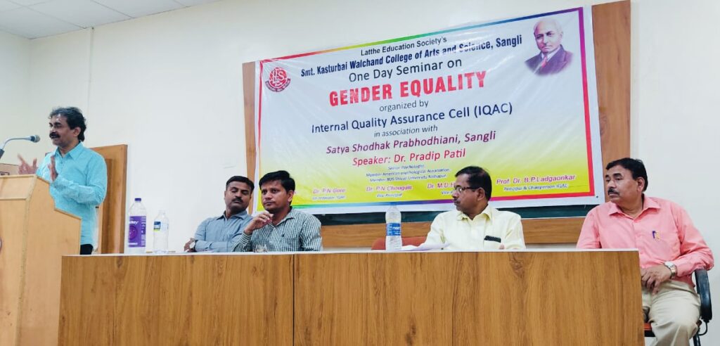 सांगली : तरुणपिढीच्या लिंगभाव समानता या विषयासंदर्भातील जाणीवा अधिक व्यापक व्हाव्यात आणि स्त्री–पुरुष नातेसंबांतील जबाबदारीची, कर्तव्याची व परस्पर बाधींलकिची जाणीव जागृती त्यांच्यामध्ये निर्माण व्हावी या हेतूने सत्यशोधक प्रबोधनी संलग्न युवा विकास प्रबोधिनी सांगली आणि श्रीमती कस्तुरबाई वालचंद महाविद्यालय सांगली यांच्या संयुक्तविद्यमाने “लिंगभाव समानता आणि स्त्री–पुरुष नातेसंबंध” विषयावर व्याख्यानाचे आयोजन करण्यात आले होते. या व्याख्यानाचे मार्गदर्शक म्हणून सुप्रसिद्ध मानसोपचार तज्ज्ञ डॉ. प्रदिप पाटील उपस्थित होते.