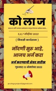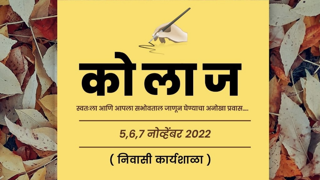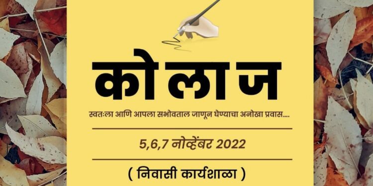 ‘युवा है हम, इंडिया’ हा युथ प्लॅटफॉर्मच्या वतीने ‘कोलाज’ या निवासी कार्यशाळेचे आयोजन करण्यात आले आहे. दिनांक ५, ६ आणि ७ नोव्हेंबर रोजी हि कार्यशाळा संपन्न होणार असून १८ ते २५ वयोगटातील तरुण तरुणींना या कार्यशाळेत सहभागी होता येणार आहे. कार्यशाळेसाठी नोंदणी आवश्यक असून १३ आक्टोबर पर्यंत नोंदणी करण्याची अंतिम मुदत असणार आहे.