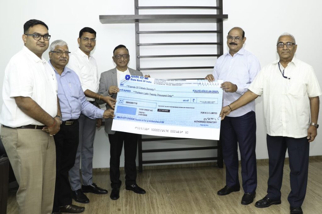 AGK Raju, Executive Director of NCC, Madhapur, Hyderabad has given away the cheque to Pankaj Adukia, Secretary, Dr. Ajay Agarwal, State Vice President, and Vishnu Gupta, Treasurer, representatives of Friends of Tribal Society. This initiative is part of NCC’s CSR interventions.